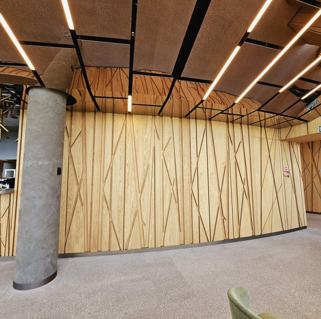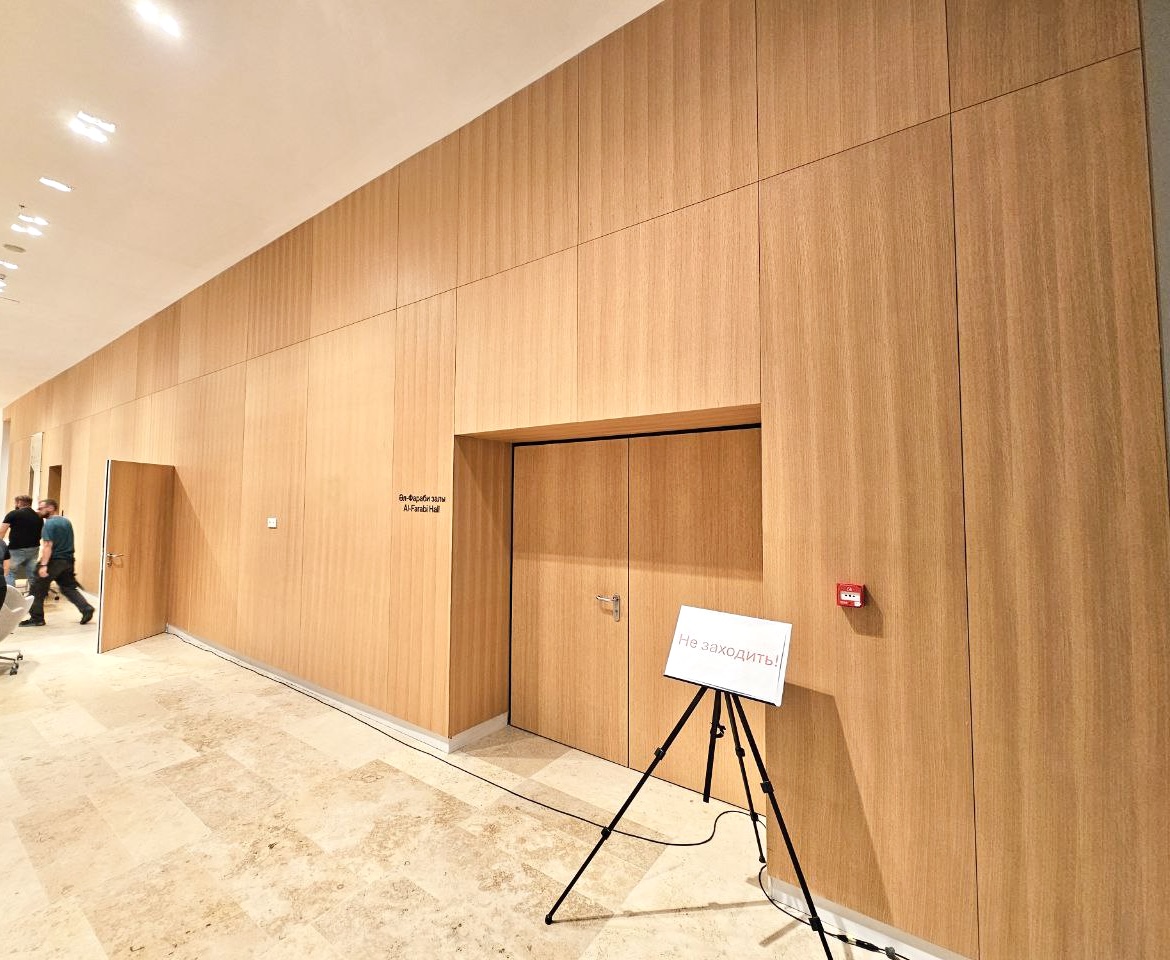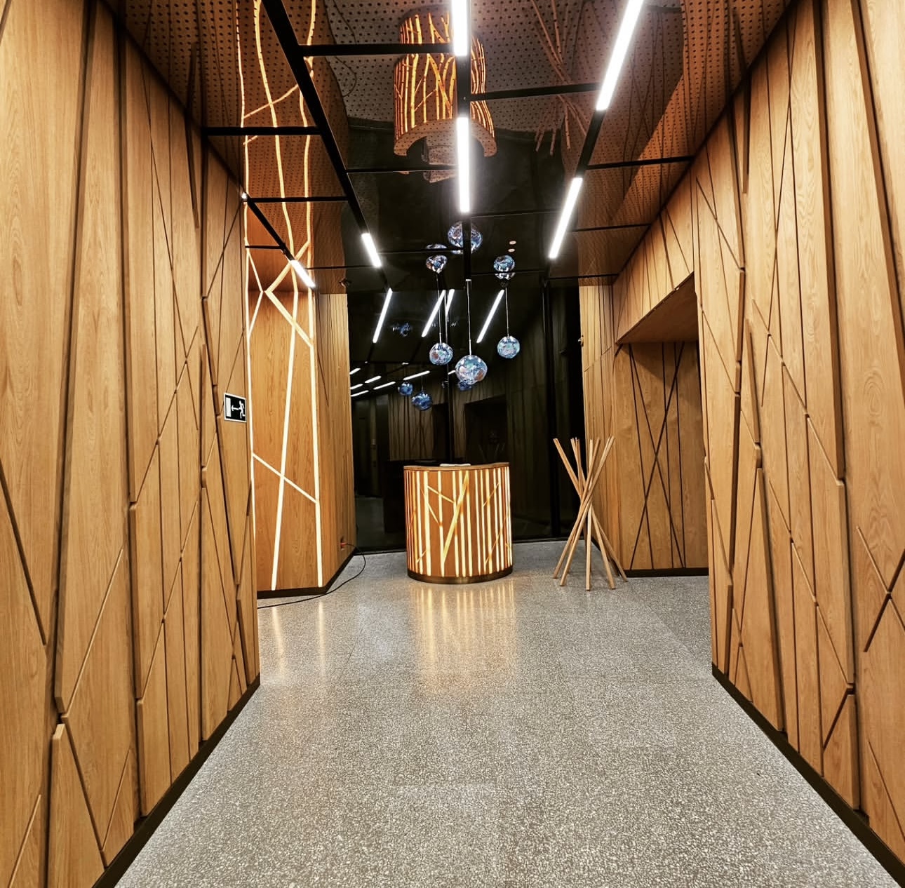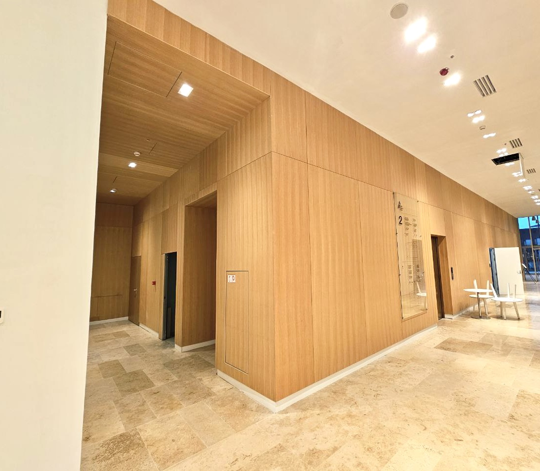 На объекте использованы рейки и панели из МДФ в шпоне дуба, покрытые морилкой и лаком класса КМ1, подходящей по стандартам пожарной безопасности