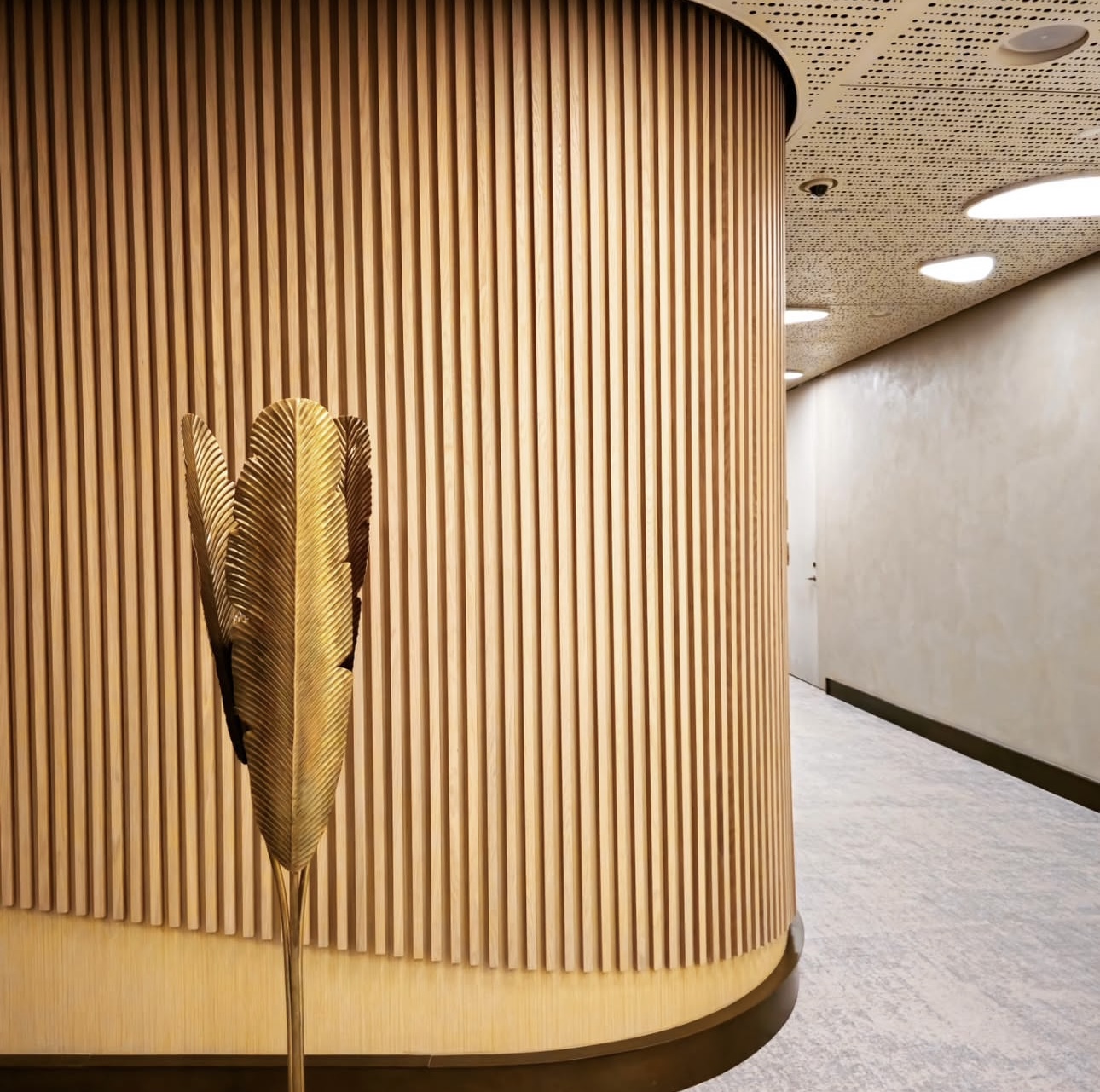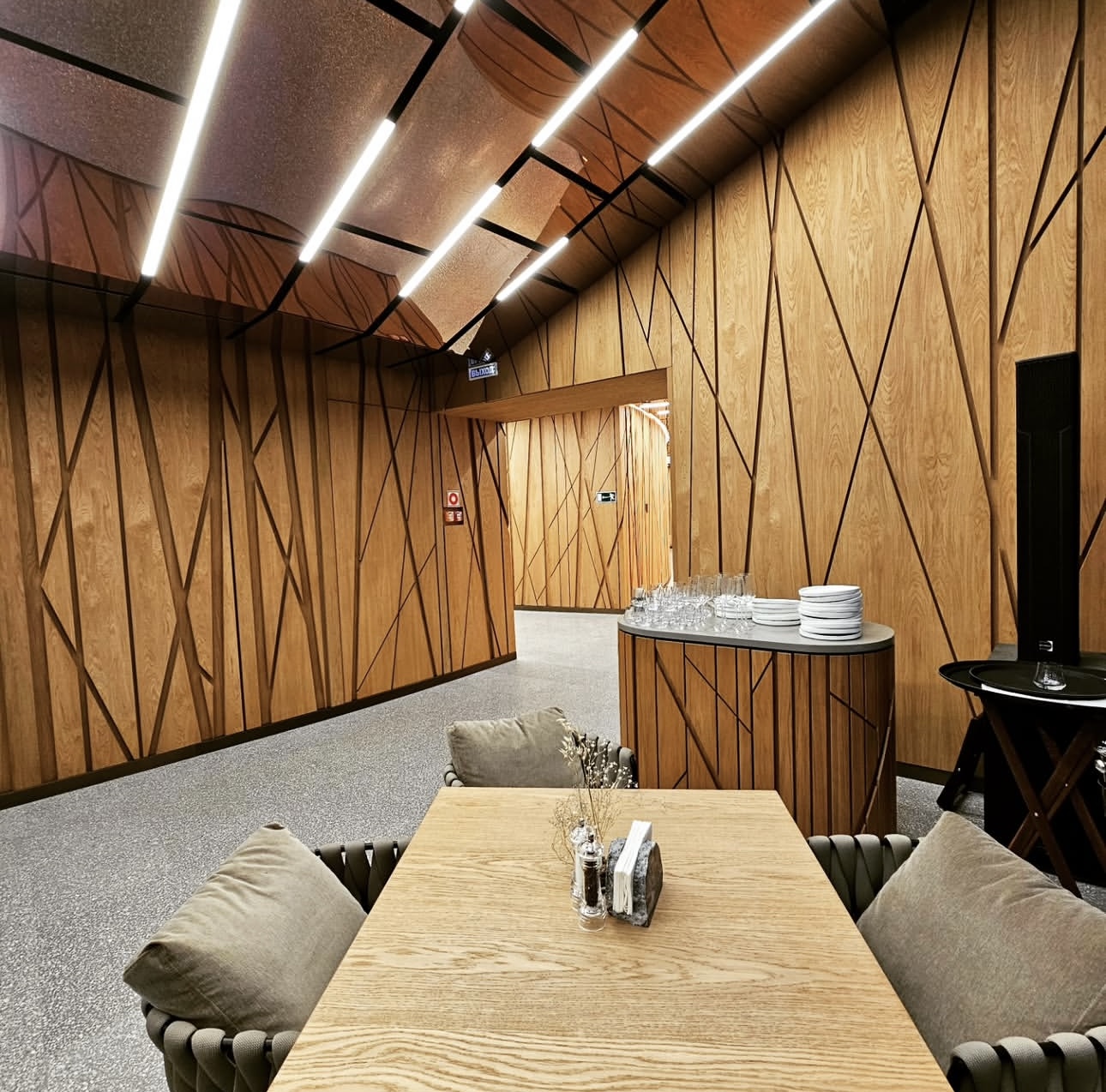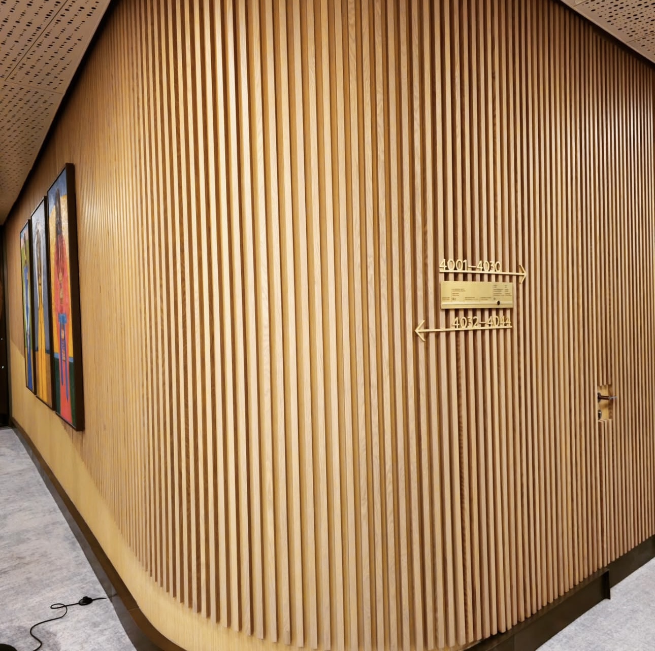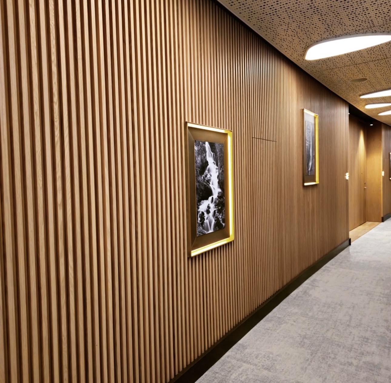 На объекте использованы рейки и панели из МДФ в шпоне дуба, покрытые морилкой и лаком класса КМ1, подходящей по стандартам пожарной безопасности