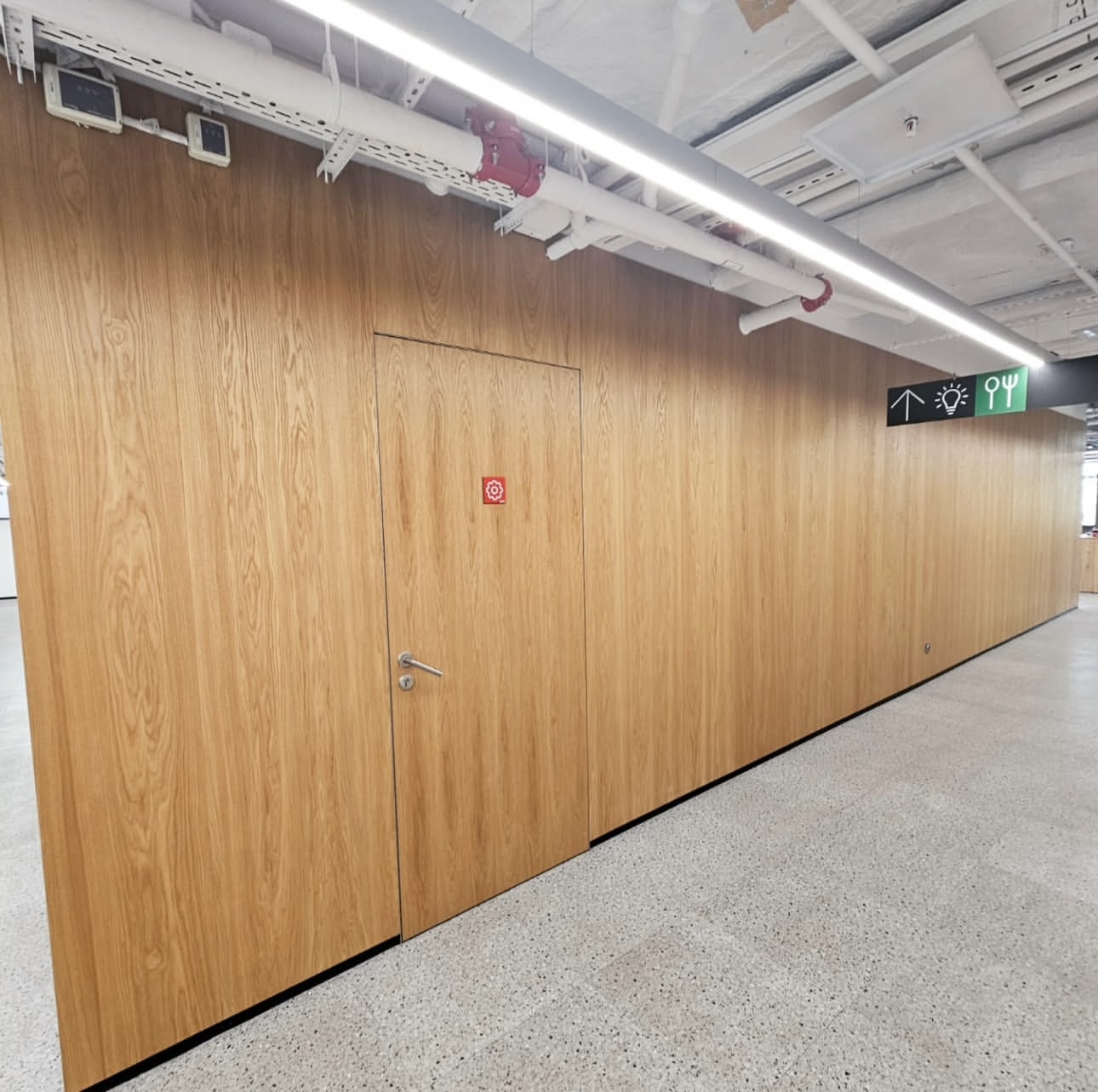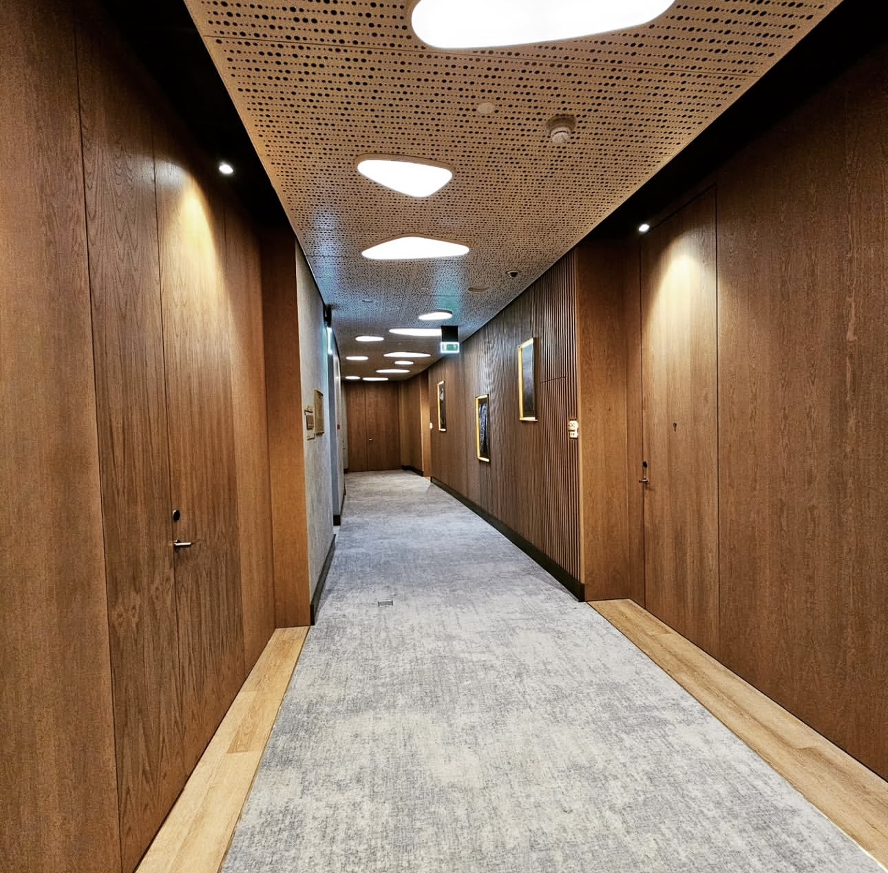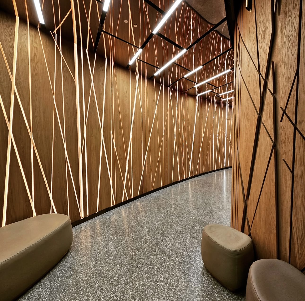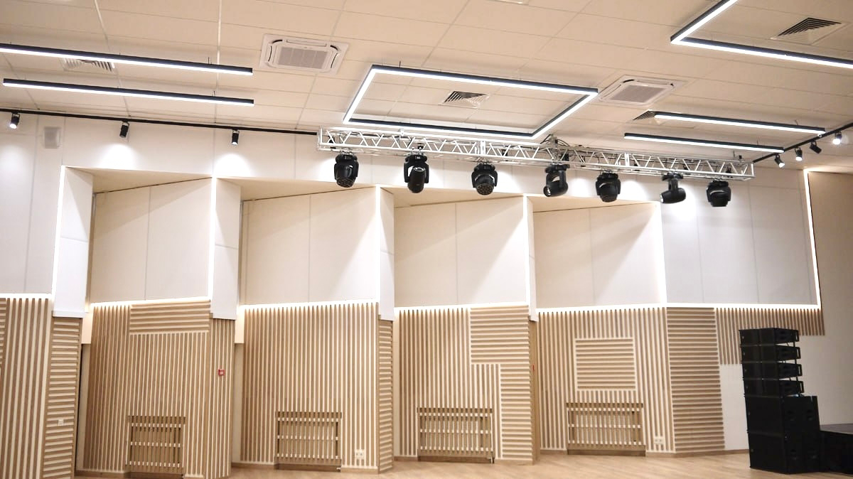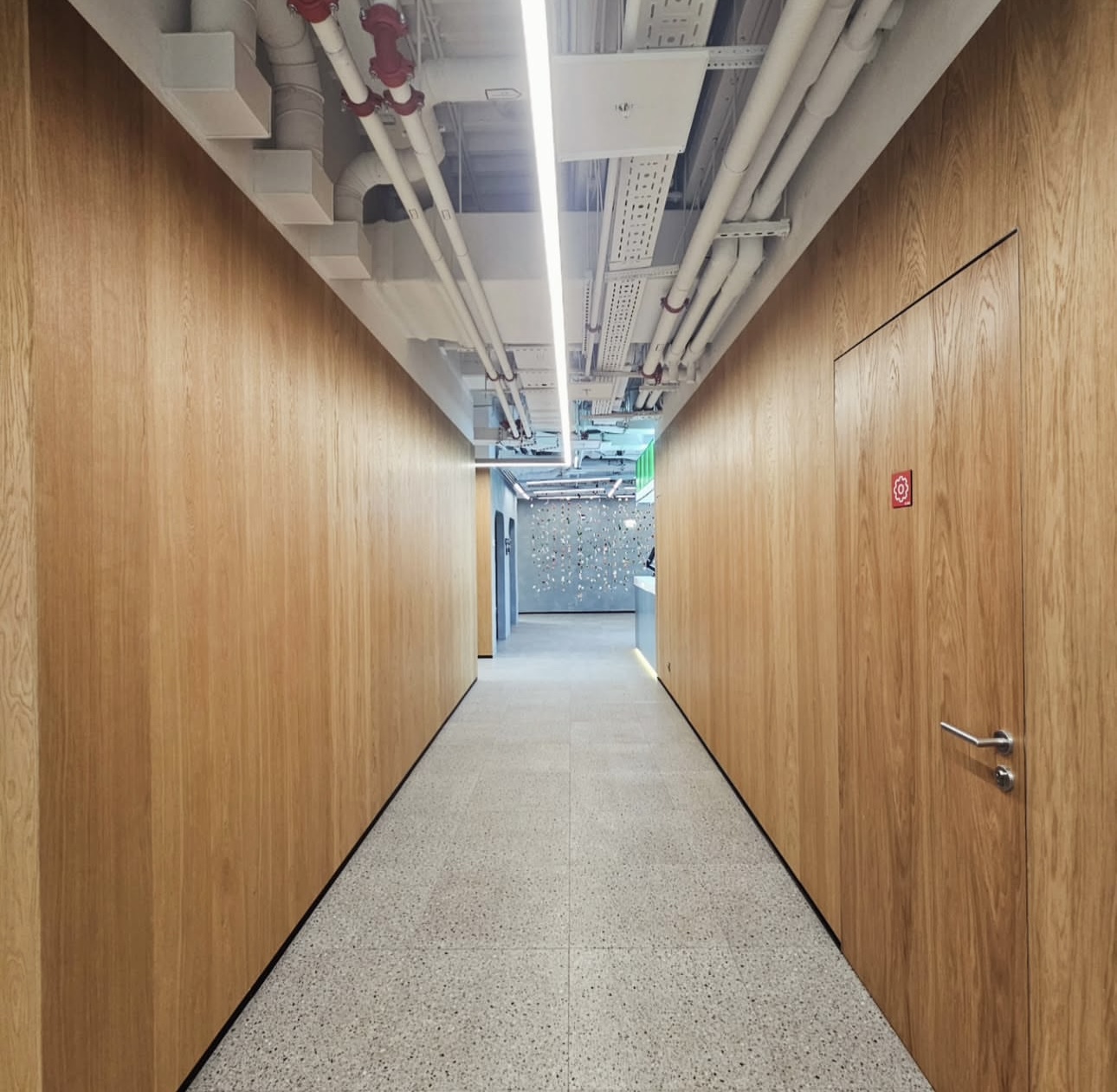 На объекте использованы рейки и панели из МДФ в шпоне дуба, покрытые морилкой и лаком класса КМ1, подходящей по стандартам пожарной безопасности