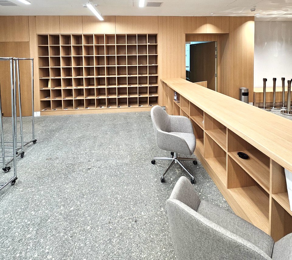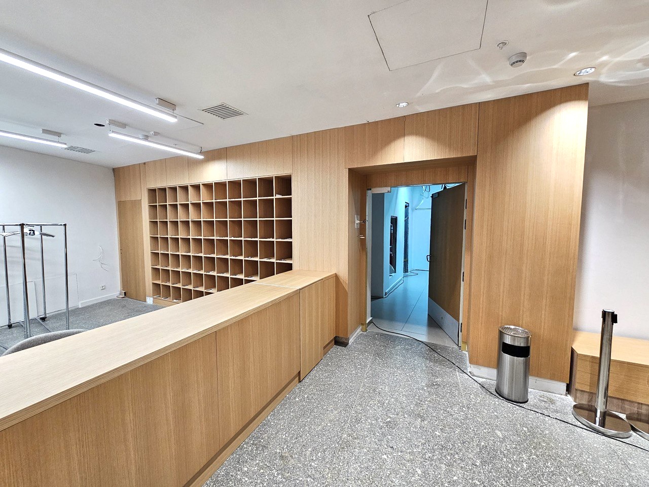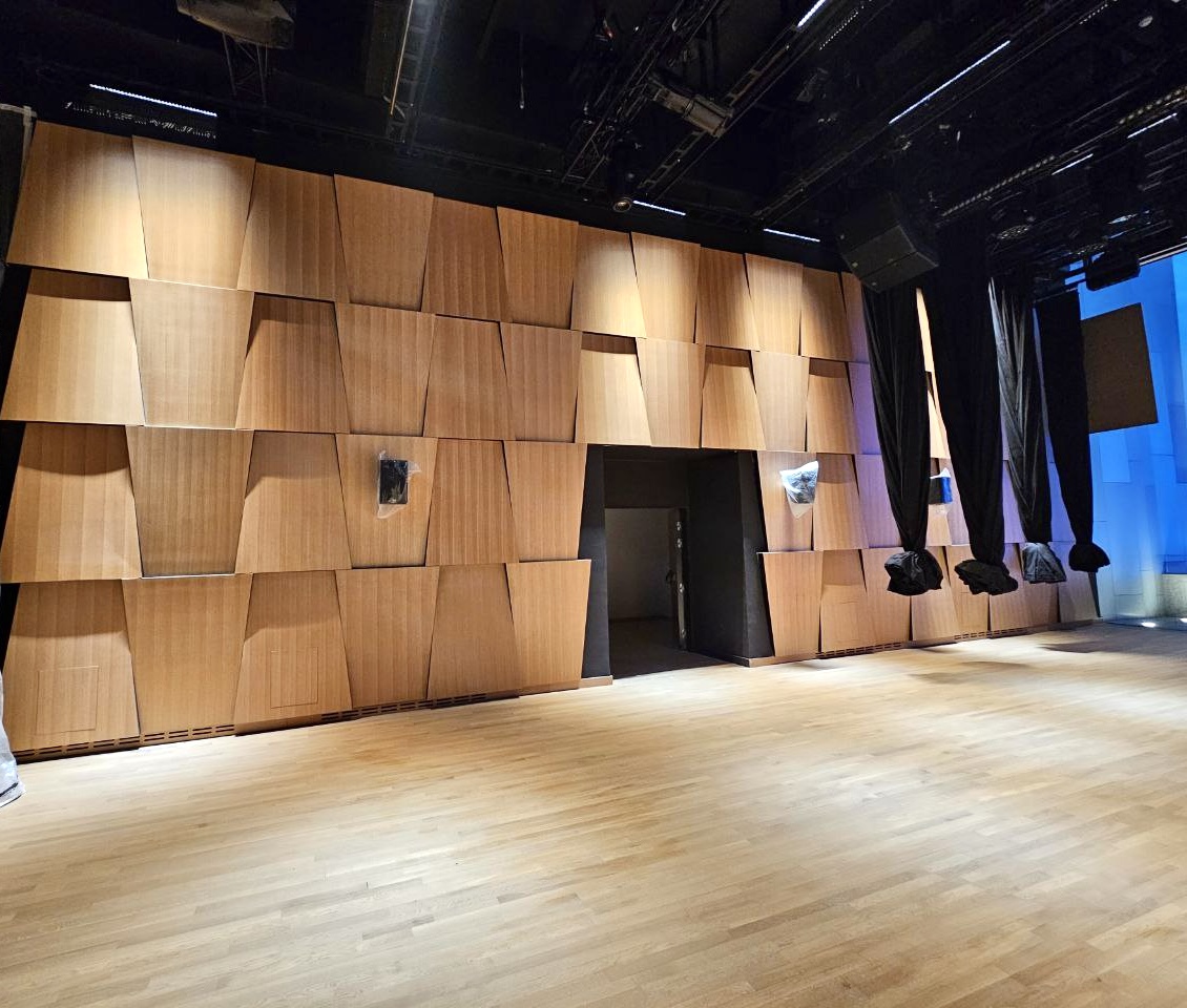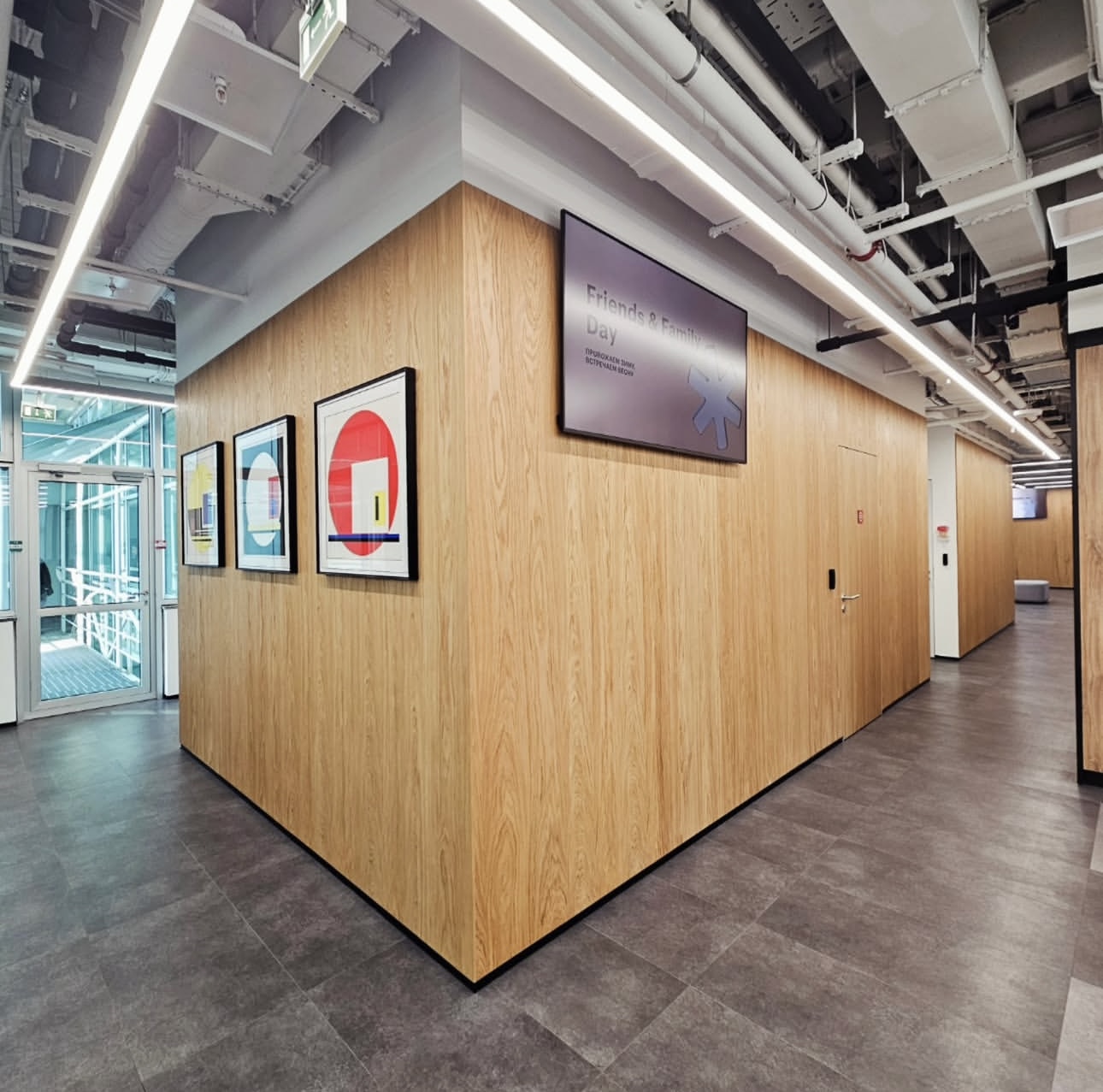 На объекте использованы рейки и панели из МДФ в шпоне дуба, покрытые морилкой и лаком класса КМ1, подходящей по стандартам пожарной безопасности