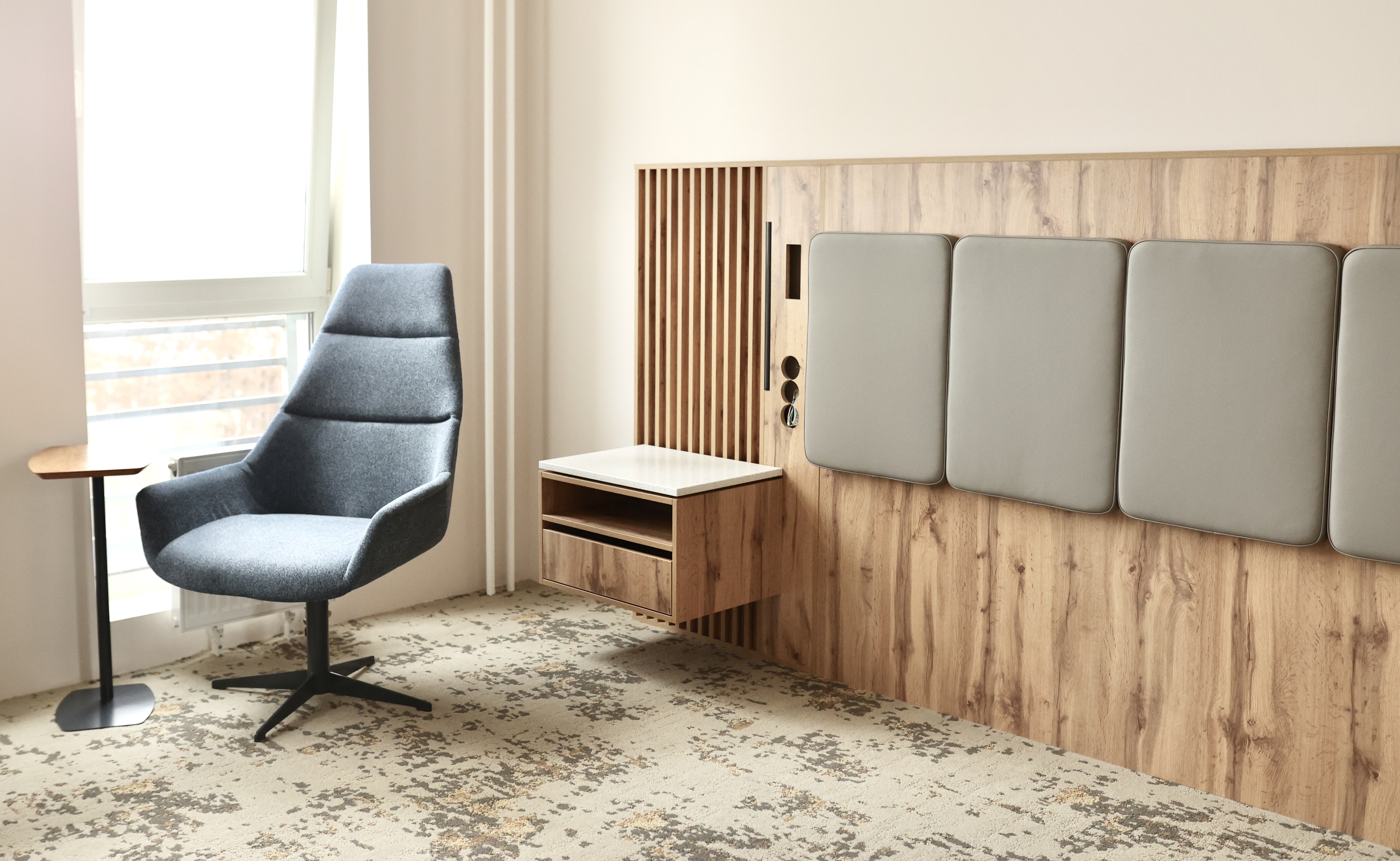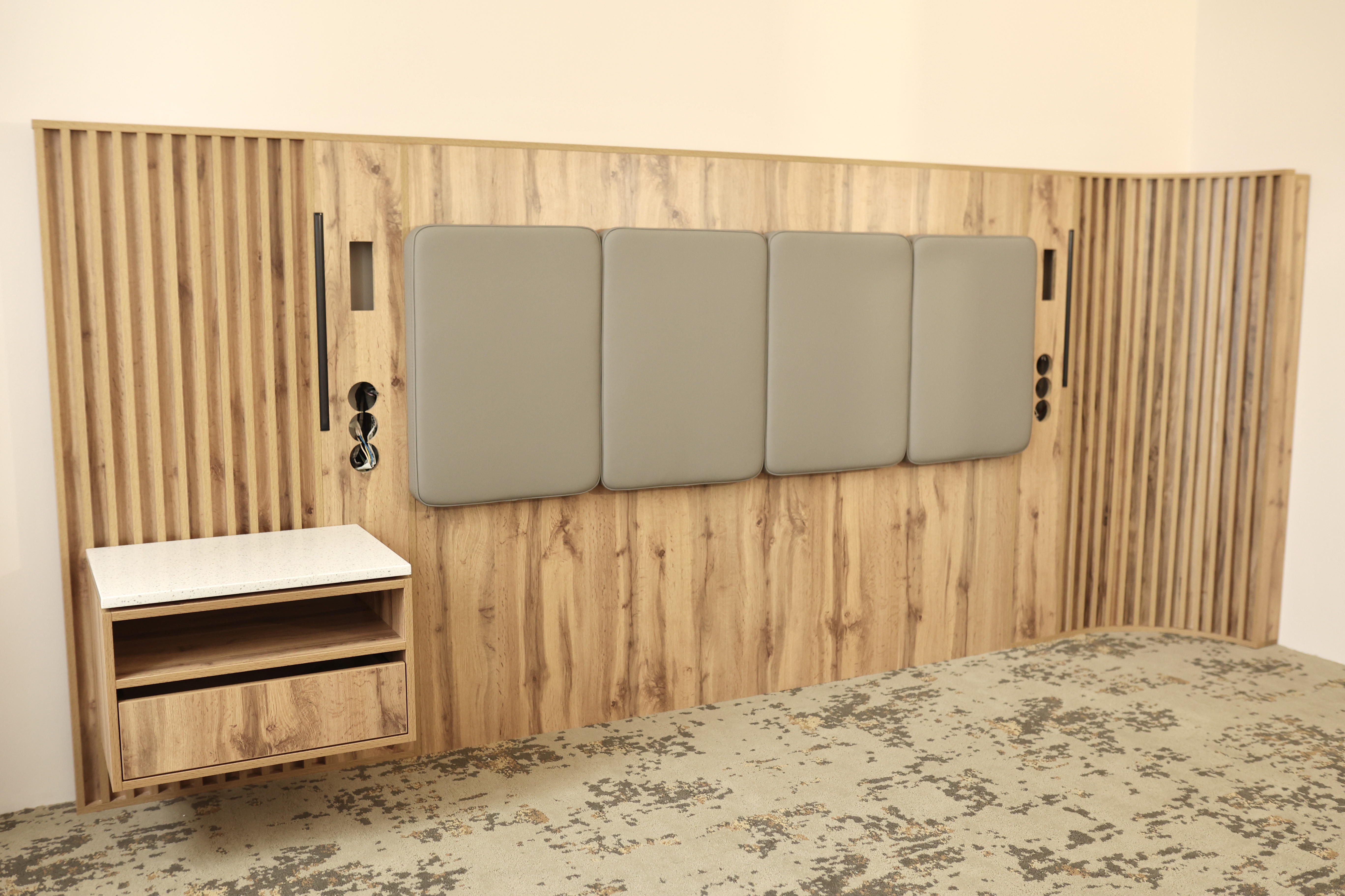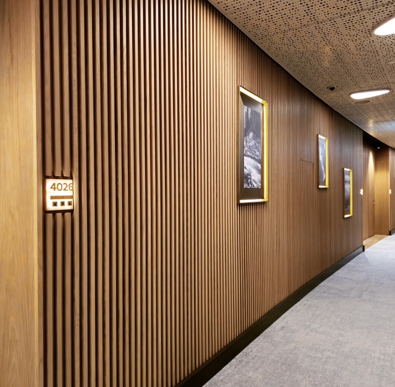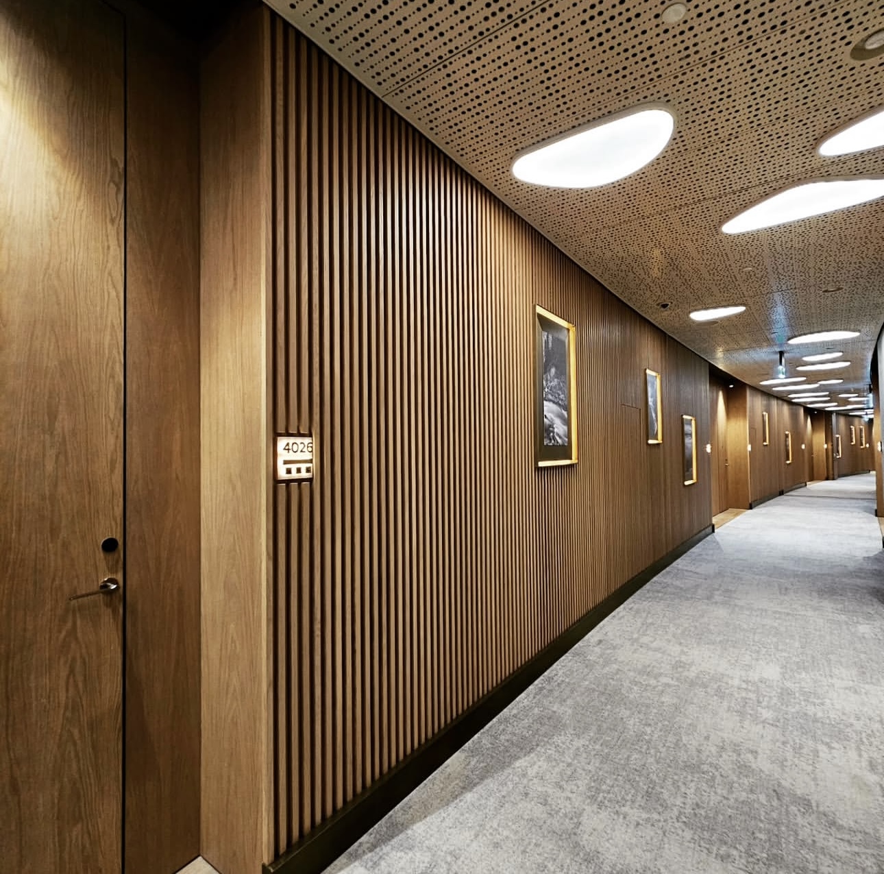 В номерах ДжуниорСьют чередуются гладкие и фрезерованные панели с латунными вставками.