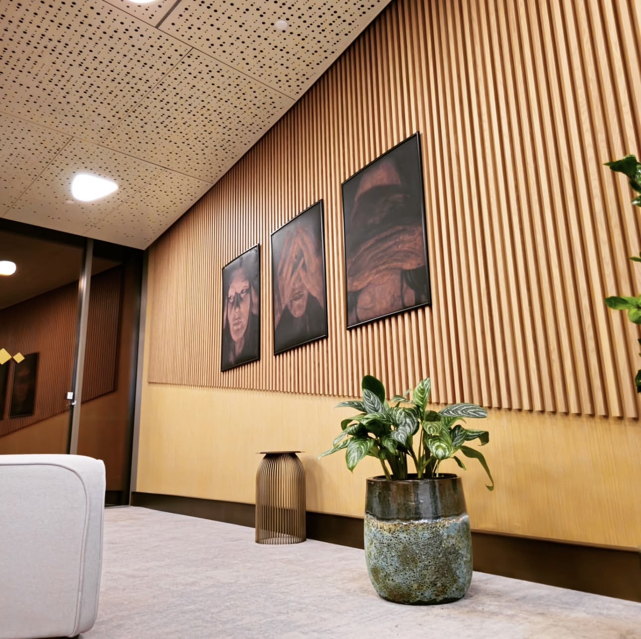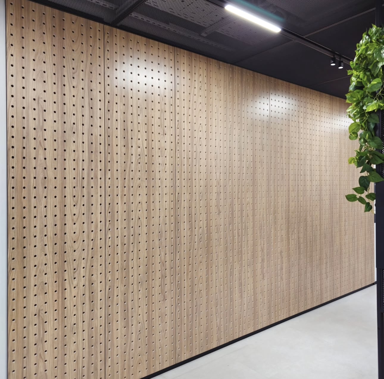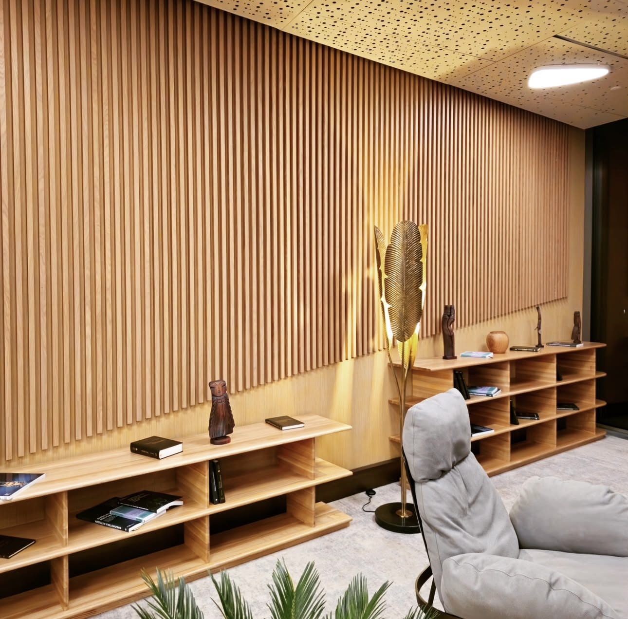 На проекте были использованы рейки из МДФ в шпоне дуба в морилке, точно подобранной по цвету в соответствии с пожеланием клиента.