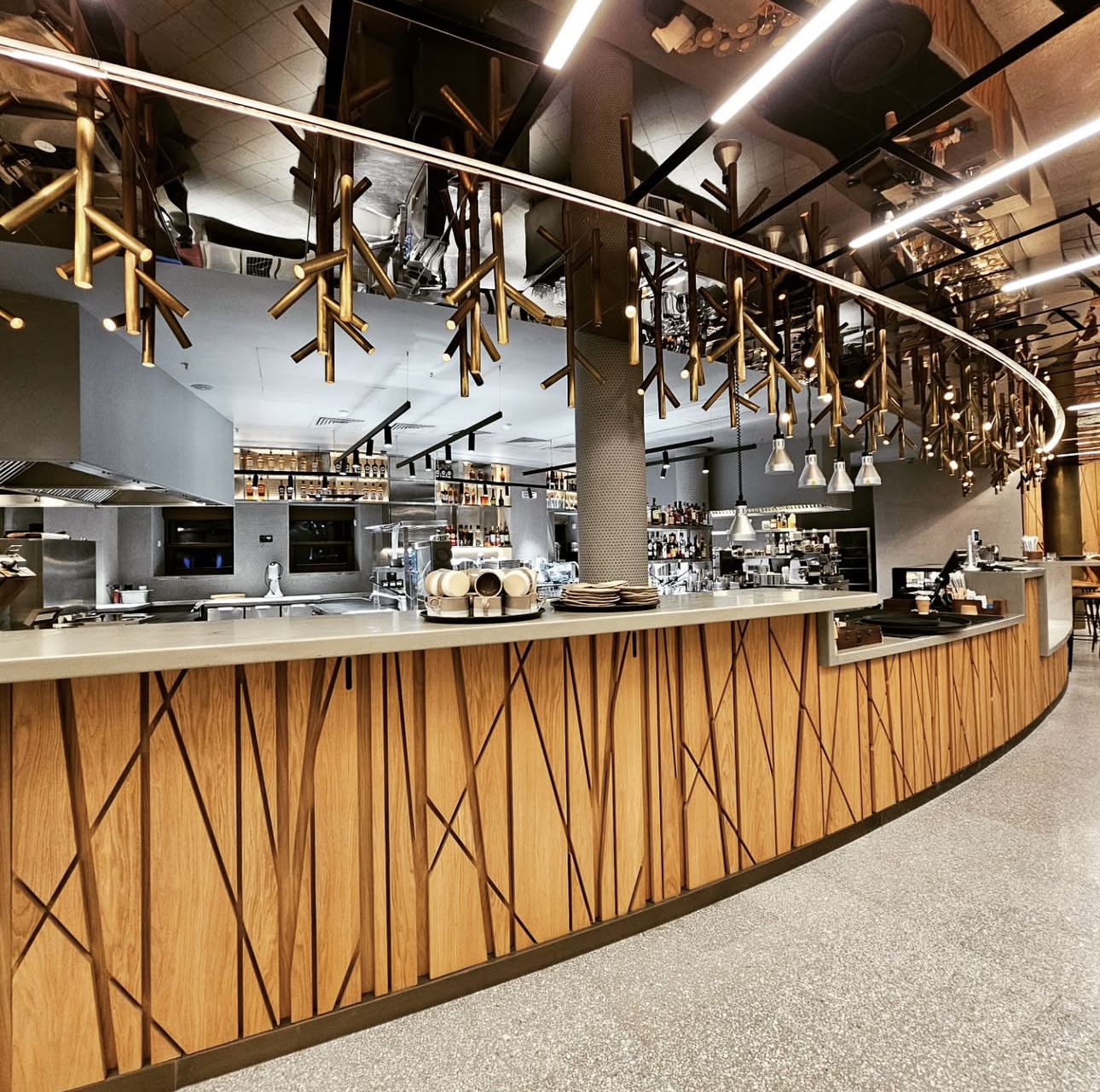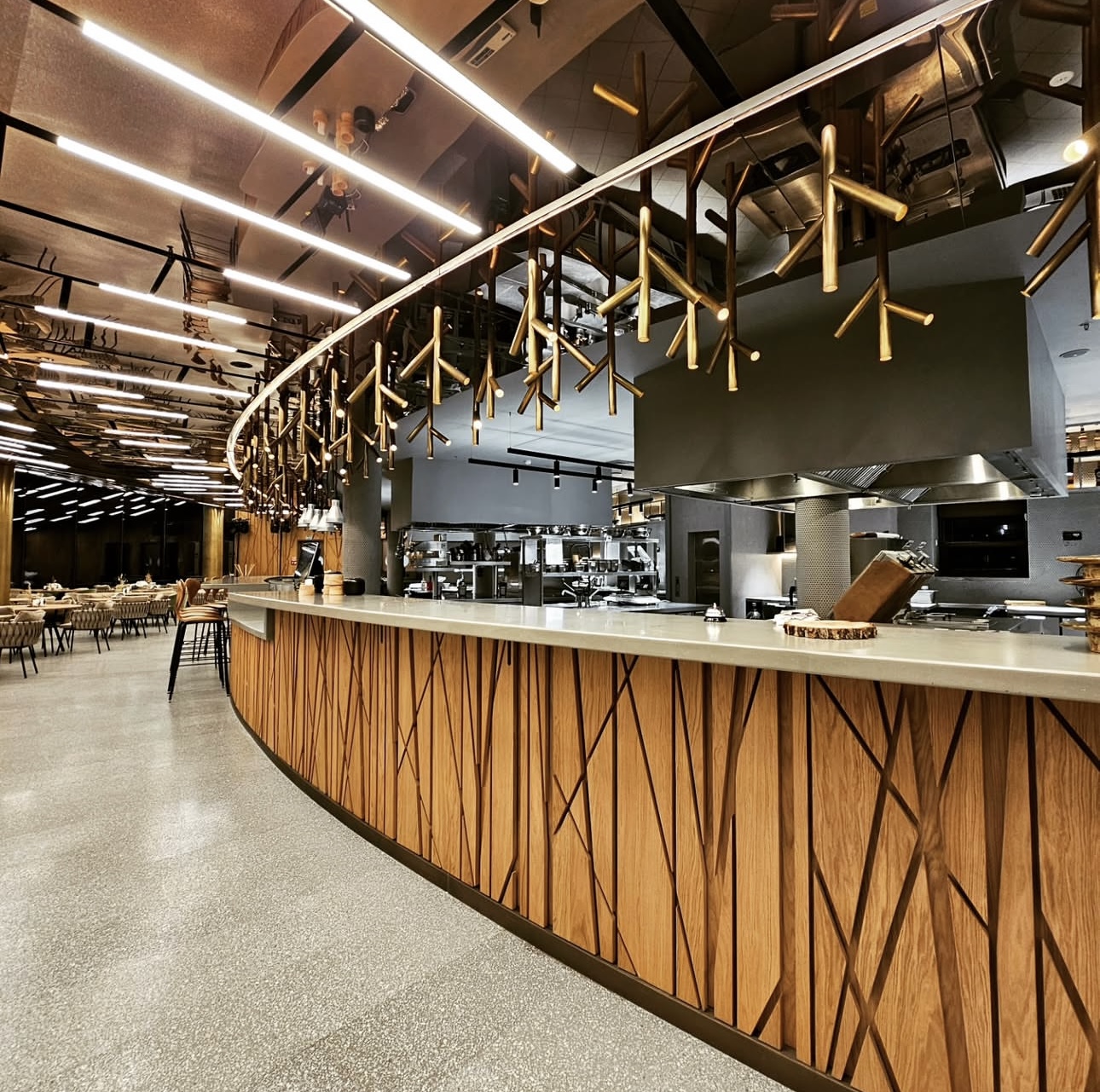Фрезерованные 3D- панели нашего производства украшают все стены ресторана и даже фасады барной стойки.