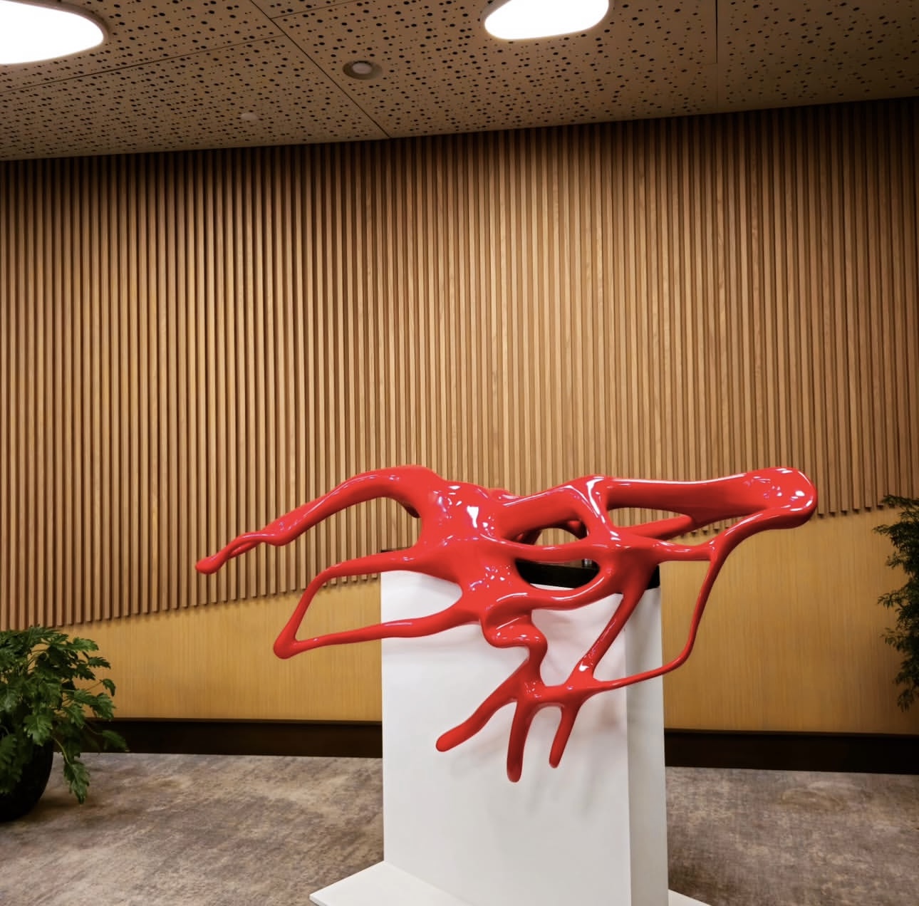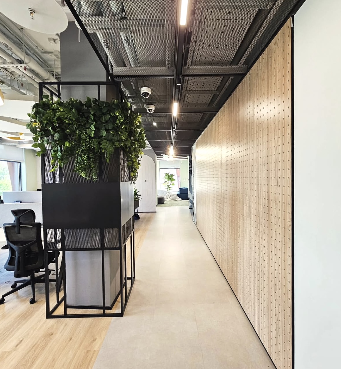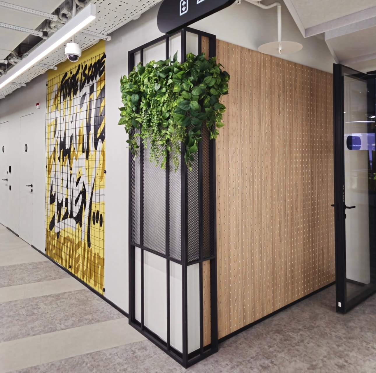 Инсталляции из натуральных растений в холлах бизнес-цента обрамляют панно из реек.