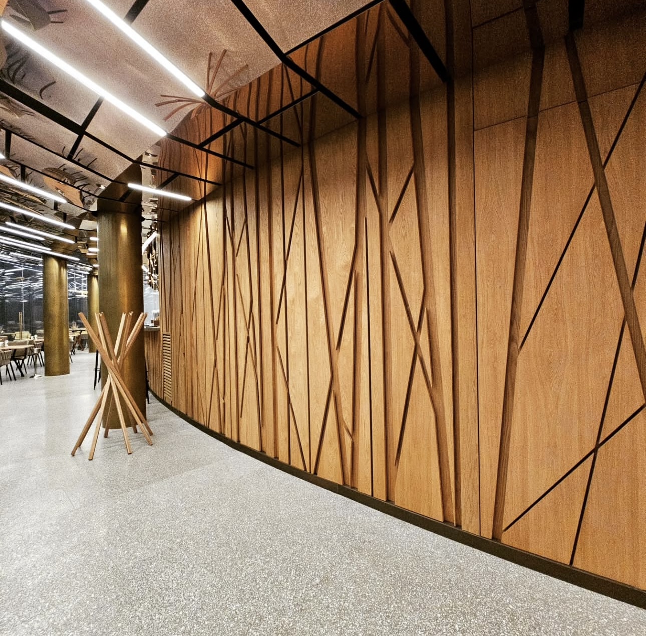 3D- панели нашего произвФрезерованныеодства украшают все стены ресторана и даже фасады барной стойки.